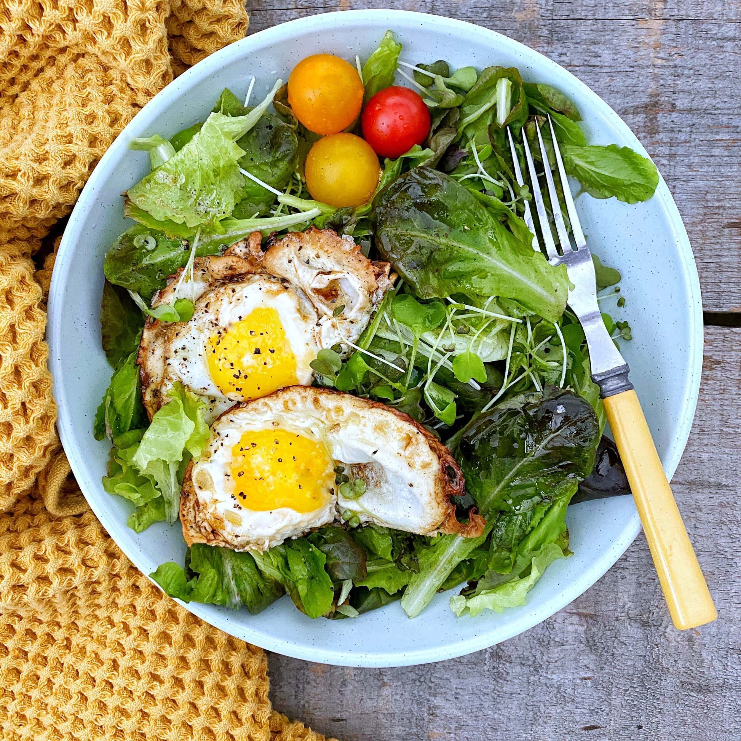 Placez le mélange printanier des Fermes GoodLeaf avec les légumes verts dans un bol, surmontez-les des œufs, arrosez avec le reste du beurre noisette de la poêle, et garnissez de tomates cerises.