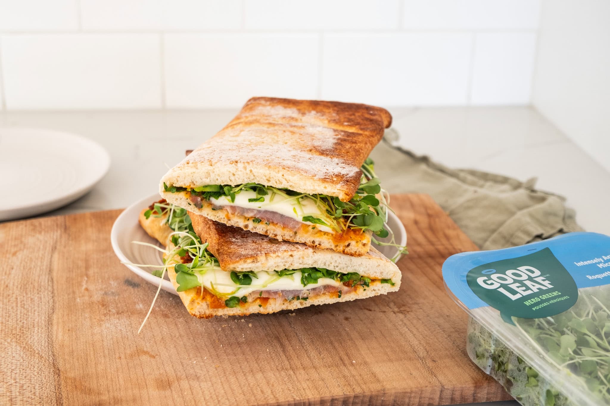 Ce sandwich pizza rapide et simple à concocter, est une recette délicieuse, débordante de saveurs et rehaussée d’une note de fraîcheur grâce aux micropousses roquette savoureuse des Fermes GoodLeaf